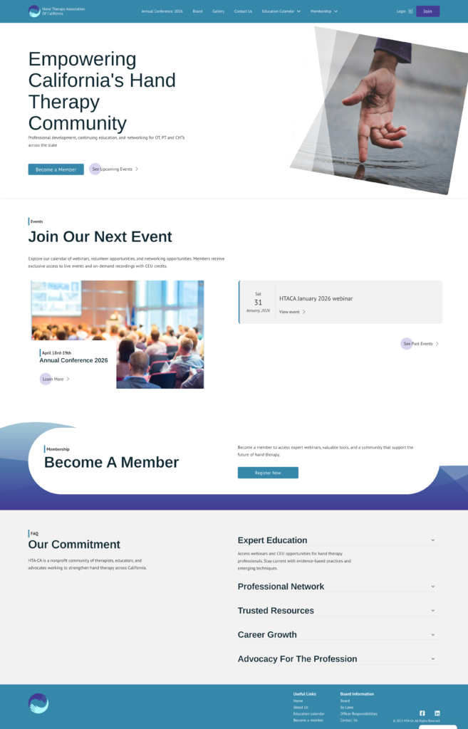 The HTA-CA website was redesigned and managed to better support a member-based healthcare organization. The work included ongoing web management, improving site structure and content clarity, and setting up reliable webinar systems for continuing education. By reducing manual workflows and improving maintainability, the platform now better supports member engagement, professional learning, and long-term organizational operations.
